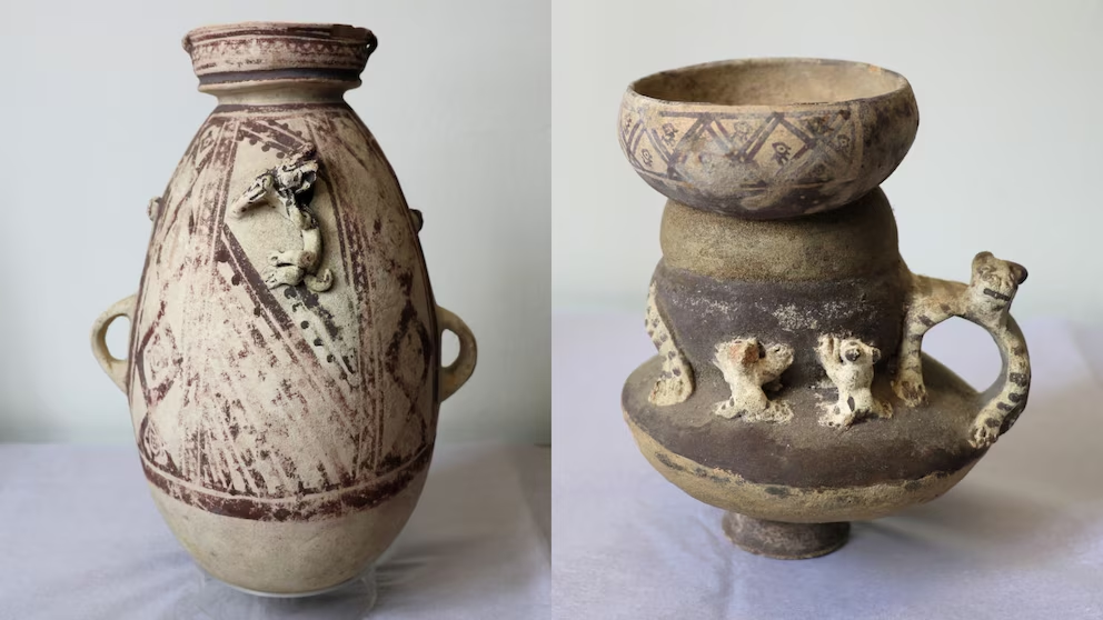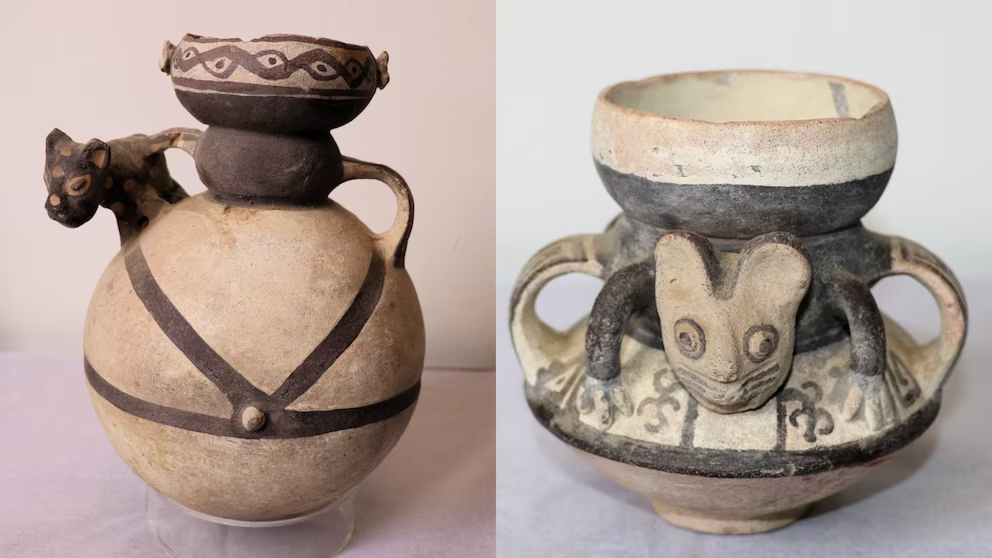 Entre las piezas restituidas se cuentan objetos de cerámica, restos óseos y un collar prehispánico, representativos de varias culturas ancestrales del Perú.
